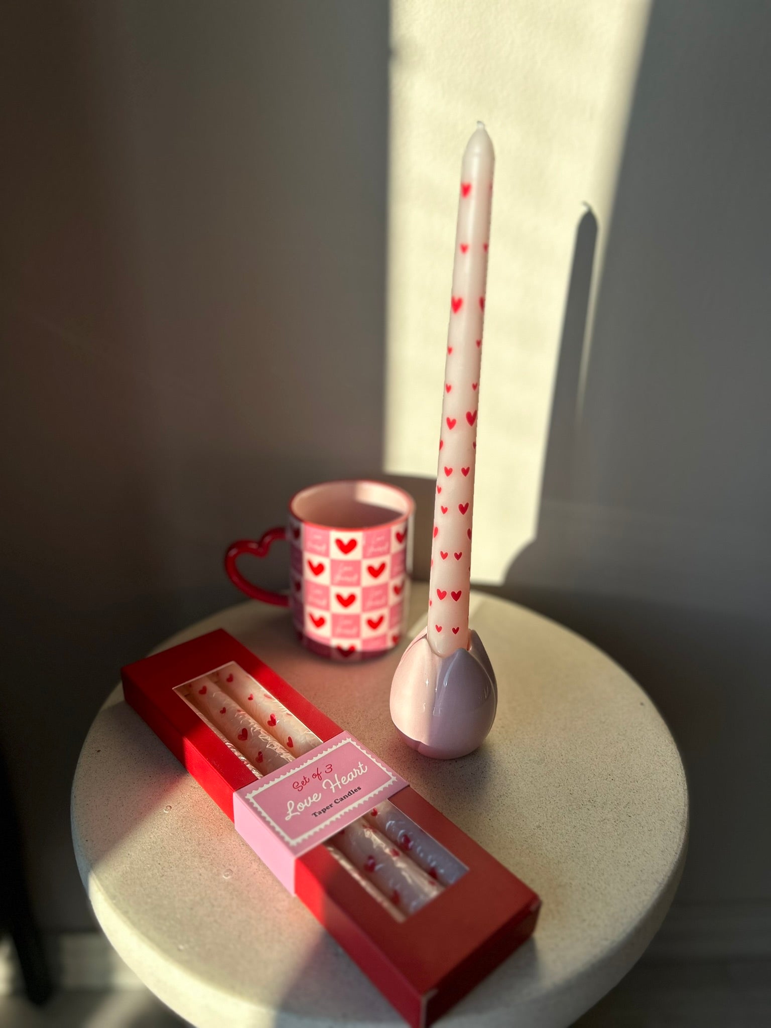 Et sett med tre kronelys med et søtt hjerte-mønster. Perfekt for å skape en lun og stemningsfull atmosfære – enten til en hyggelig middag eller rolige kvelder hjemme.